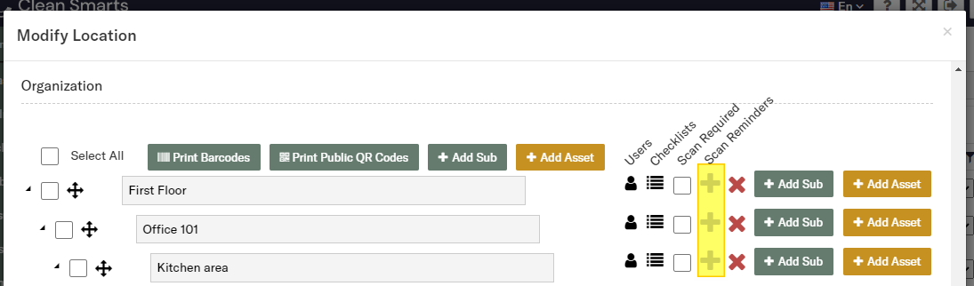 - Scroll down to the "Organization" section. If you have not created any sublocations, create them here. (See related article). Click the grey plus sign next to the sublocation or area for which you would like cleaners to receive reminders to visit and clean.