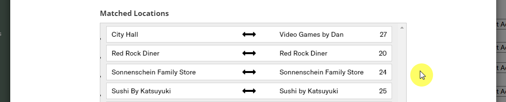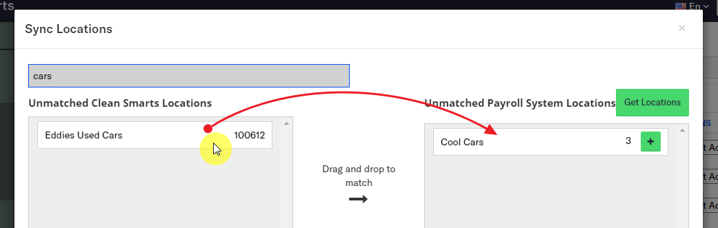 4. If the customer already has a location in Clean Smarts that needs to be associated with the customer account in your payroll software, drag the location card from the left-hand box to the right-hand box. This will associate the payroll software's customer ID with the Clean Smarts location.