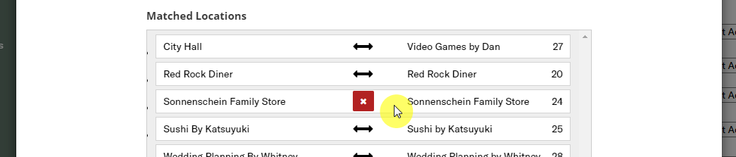 6. You can always disconnect the payroll software customer number from the Clean Smarts location by hovering your mouse over the location card in the bottom panel. A red X button will appear over the double arrow icon. Click the button to remove the payroll software customer ID from the Clean Smarts location profile. The account will be removed from the bottom panel and will re-appear in the left- and right-hand panels as unassociated profiles in the respective systems.