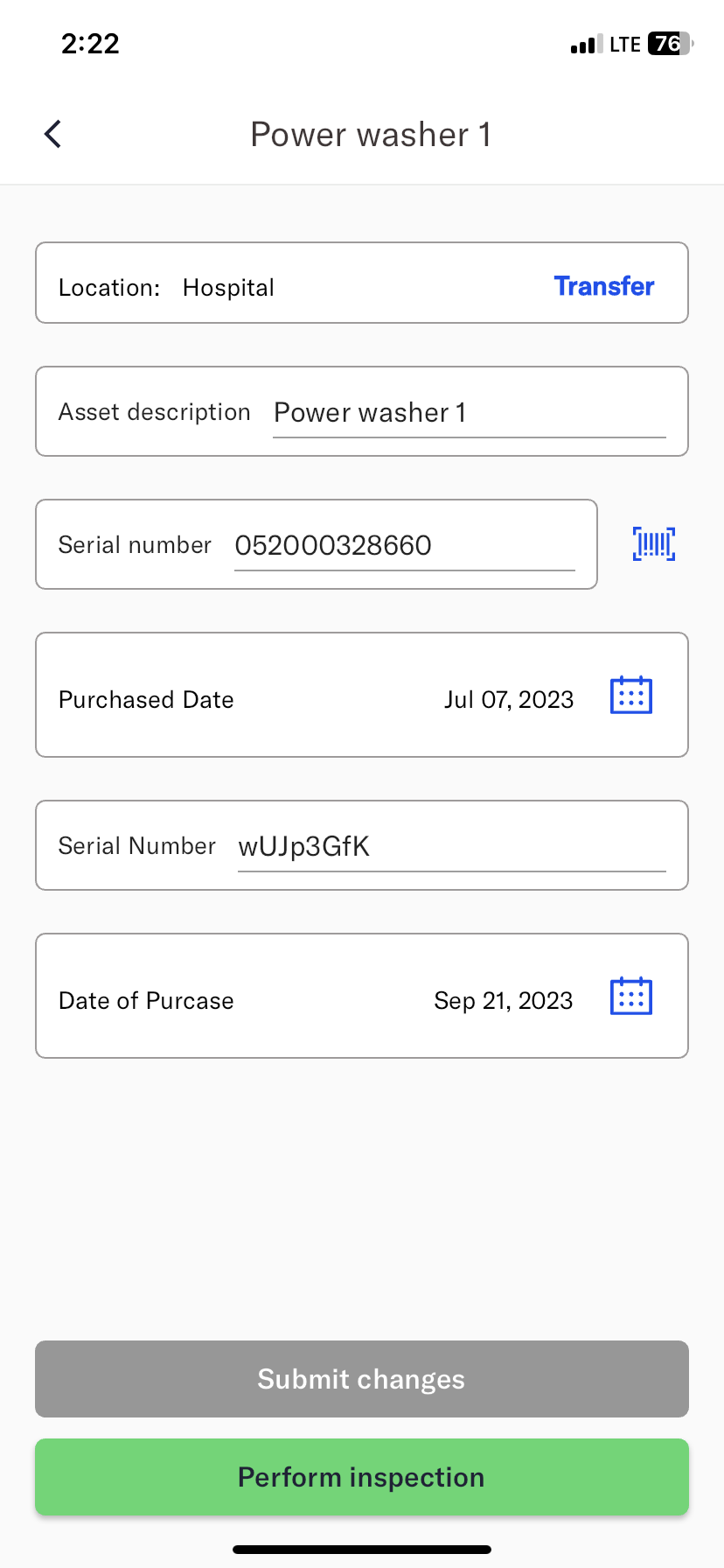 From the homepage select "More" at the bottom. Navigate to "Assets" and select the asset you want to transfer. At the top of this page you can see the current location of the asset. Next to the location, click "Transfer".