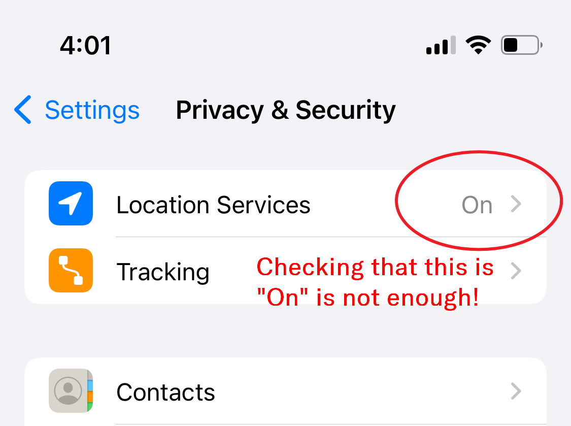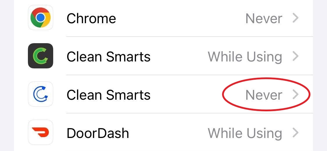 For iOS, go to Settings > Privacy & Security > Location Services. Even if Location Services has the word "On" next to it, you need to tap on the arrow to the next screen to check whether location sharing is on for Clean Smarts, specifically (see the screenshots below). Find Clean Smarts in the list of apps, tap on it, and select "While Using the App" or "Always".